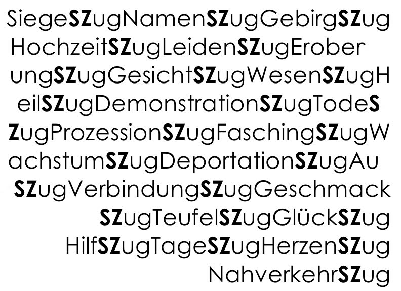 „BAUM“ verdeutlicht eine Besonderheit der deutschen Sprache: Das Kompositum, das zusammengesetzt aus zwei Substantiven einen neuen Begriff bildet. Die grafische Baumform wird aus den Bezeichnungen verschiedenster Baumarten gebildet.